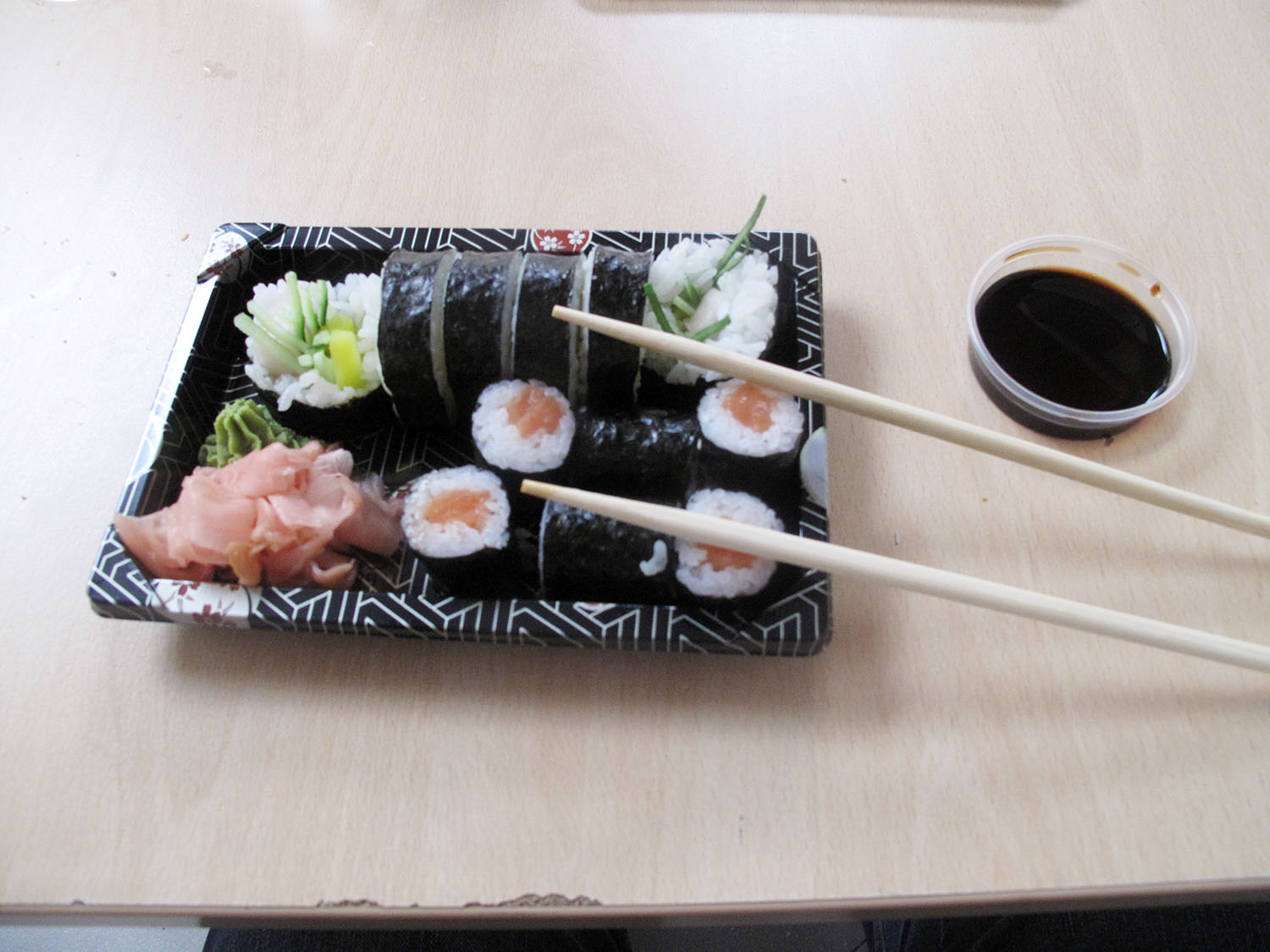 Tuż za wejściem ulokowali się kulinarni masterchefowie konwentu. U jednego z nich zamówiłem zestawy sushi w cenach nadzwyczaj atrakcyjnych, w porównaniu do warszawskich restauracji. Ten widoczny poniżej, kosztował jedynie 25 zł, a podczas realizacji zamówienia, klient sam decyduje o składnikach. Po otrzymaniu wymarzonego posiłku, udałem się na piętro, gdzie przy stoliku nikt nie śmiał przeszkadzać posilającym się konwentowiczom. Moje Maki i Onigiri były jak niebo w gębie! Za to chylę czoła dla sushimasterów. Warto nadmienić, że na piętrze była jeszcze jedna restauracja, ale korzystałem z niej okazjonalnie, kupując jedynie wodę. Dlatego pozostawię ocenę serwowanych dań innemu dziennikarzowi.